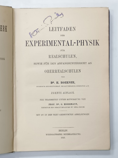 LEITFADEN DER EXEPEIMENTAL - PHYSYIK FUR REALSCHULEN von Dr. H. BOERNER , 1915 , TEXT IN LIMBA GERMANA