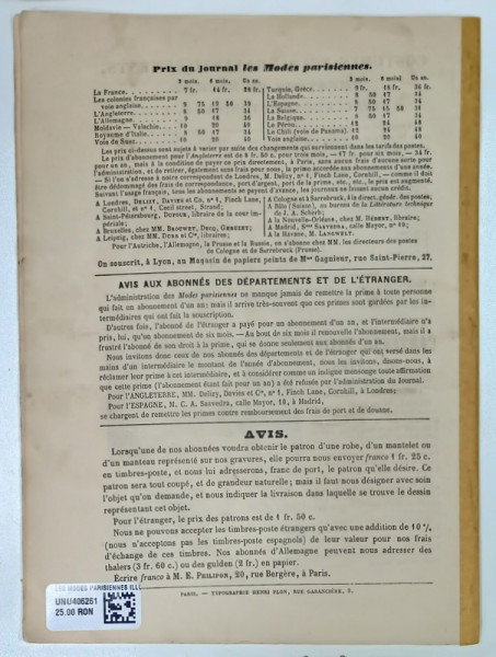 LES MODES PARISIENNES ILLUSTREES , JOURNAL DE LA BONNE COMPAGNIE , NO. 1471 , 1872