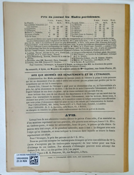 LES MODES PARISIENNES ILLUSTREES , JOURNAL DE LA BONNE COMPAGNIE , NO. 1476 , 1872