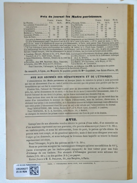 LES MODES PARISIENNES ILLUSTREES , JOURNAL DE LA BONNE COMPAGNIE , NO. 1488 , 1872