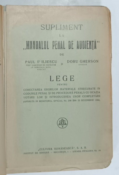 MANUALUL PENAL DE AUDIENTA , CODUL PENAL SI PROCEDURA PENALA ' CAROL II ' de PAUL P. ILIESCU si DORU GHERSON , 1936