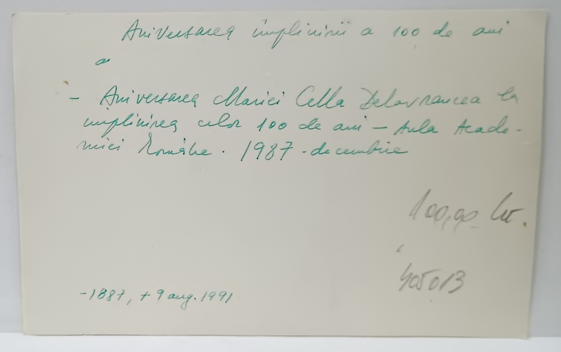 MARIA CELLA DELAVRANCEA IN AULA ACADEMIEI ROMANE , LA IMPLINIREA VARSTEI DE 100 DE ANI , FELICITATA DE ZOE DUMITRESCU - BUSULENGA , DECEMBRIE 1987, FOTOGRAFIE