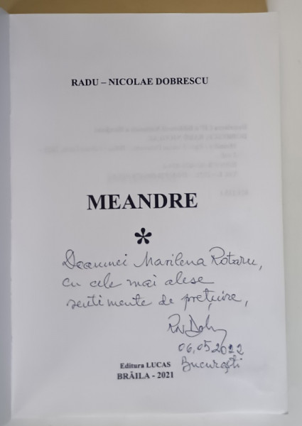 MEANDRE , VOLUMUL I de RADU - NICOLAE DOBRESCU , 2021 *DEDICATIE