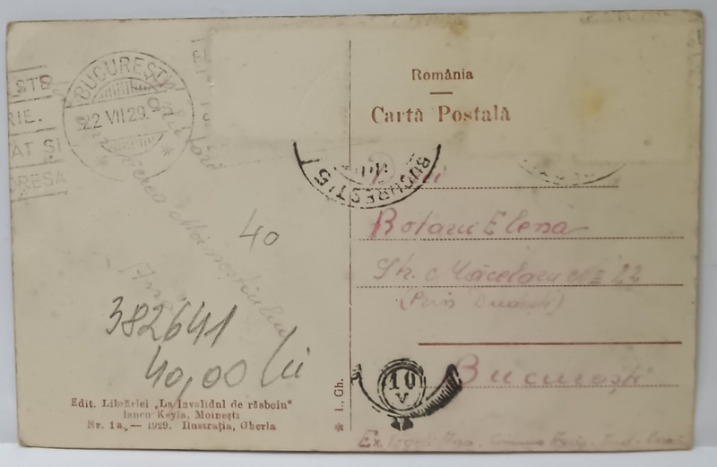 EDITURA LIBRARIEI '' LA INVALIDUL DE RAZBOI '' MOINESTI , MONOCROMA, CIRCULATA , CARTE POSTALA