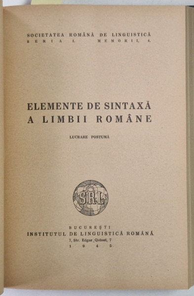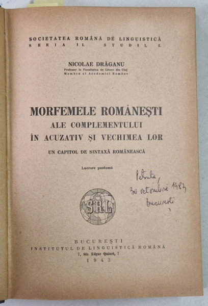 MORFEMELE ROMANESTI ALE COMPLEMENTULUI IN ACUZATIV SI VECHIMEA LOR / ELEMENTE DE SINTAXA A LIMBII ROMANE / SINTAXA LIMBII ROMANE , COLEGAT DE 3 LUCRARI , 1943 - 1945