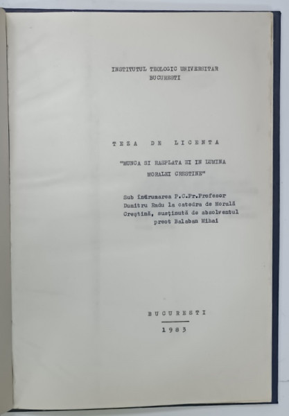MUNCA SI RASPLATA EI IN LUMINA MORALEI CRESTINE , TEZA DE LICENTA de BALABAN MIHAI , 1983