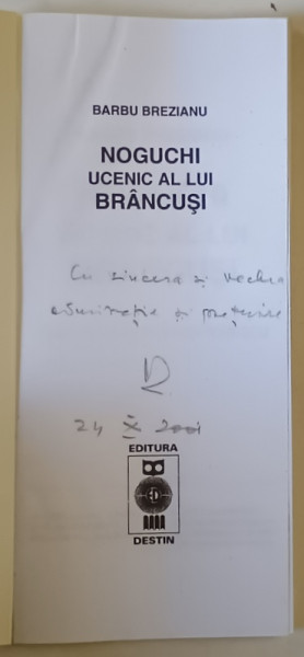 NOGUCHI , UCENIC AL LUI BRANCUSI de BARBU BREZIANU , 2001 *DEDICATIE