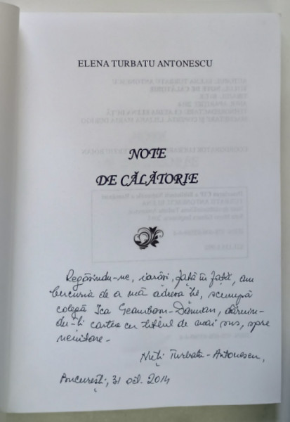 NOTE DE CALATORIE de ELENA TURBATU ANTONESCU , 2014 *DEDICATIE
