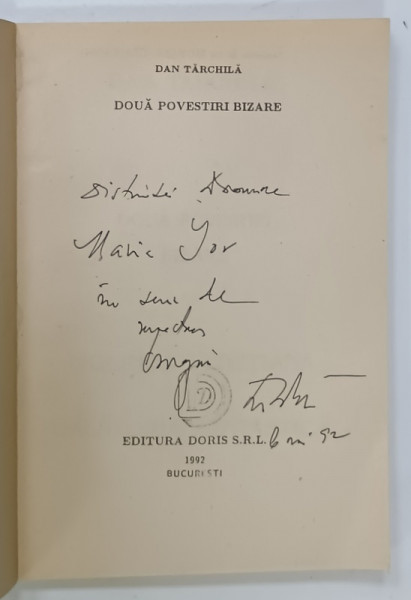 OGLINDA VENETIANA , DOUA POVESTIRI BIZARE de DAN TARCHILA , 1992 , DEDICATIE *