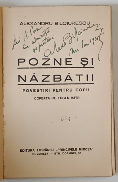 PATANII SI NAZBATII , POVESTIRI de ALEXANDRU BILCIURESCU , coperta de E. ISPIR , 1935 , DEDICATIE *