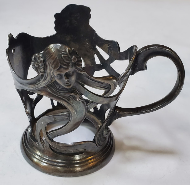 4 suporturi argintate pentru pahare,decorate cu motive vegetale si chip de femeie