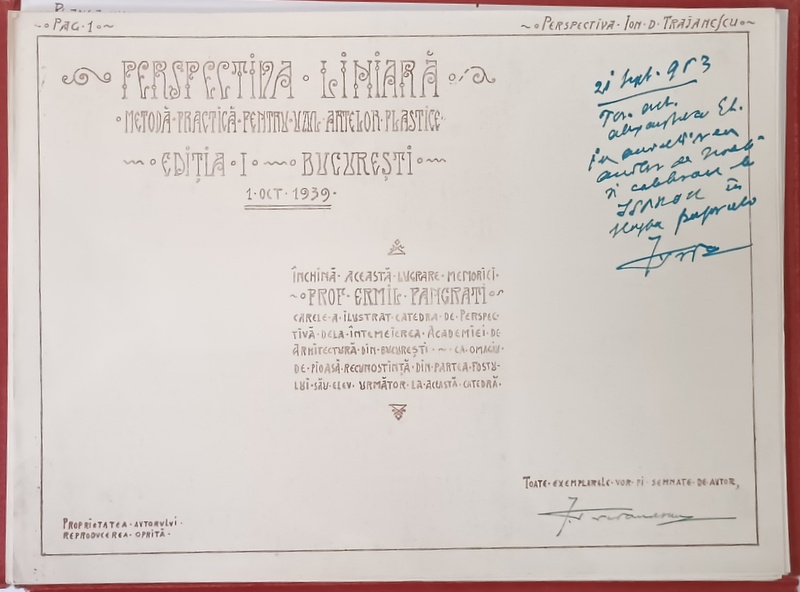 Exemplarul conține semnătura autorului, arhitectul Ion D. Trajanescu si dedicatia acestuia semnata olograf *, mapa cartonata .