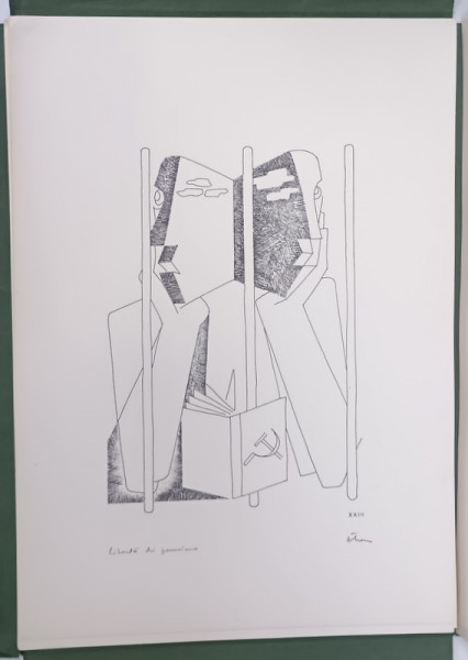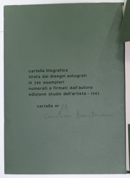 TIPARITE LA ROMA , CONTINE 42 DE LITOGRAFII VOLANTE DUPA DESENE de CAMILIAN DEMETRESCU , SEMNATE OLOGRAF SI INTITITULATE DE AUTOR CU CREIONUL PE FIECARE PLANSE , EXEMPLAR NUMEROTAT 23 DIN 290 , SEMNAT DE AUTOR PE MAPA , PLANSE MONOCROME , DIMENSIUNE PLANSA 34 .8 x 24.9 cm. , MAPA BROSATA , TEXT IN LIMBA ITALIANA