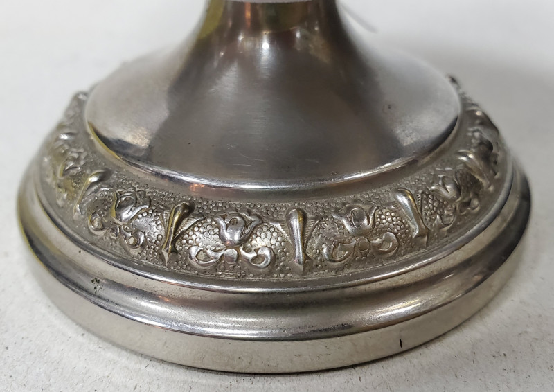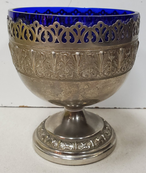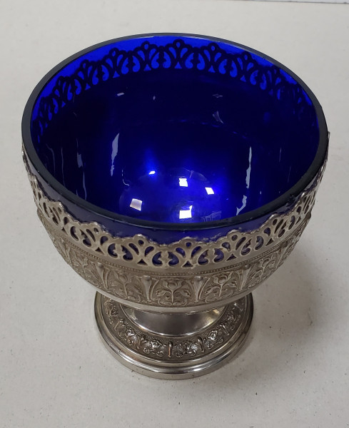 Pocal din metal si sticla decorat cu motive vegetale.