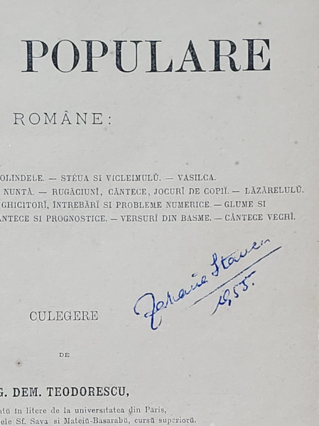 POESII POPULARE ROMANE, CULEGERE de G. DEM . TEODORESCU - BUCURESTI, 1885* Exemplarul lui Zaharia Stancu