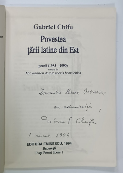 POVESTEA TARII LATINE DIN EST , POEZII ( 1985 -1990 ) de GABRIEL CHIFU , 1994 , DEDICATIE *