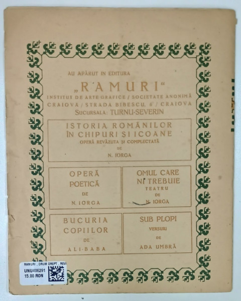 RAMURI , DRUM DREPT , REVISTA LITERARA SAPTAMANALA , DIRECTOR N. IORGA , ANUL XVII , NUMARUL 21 , 1923
