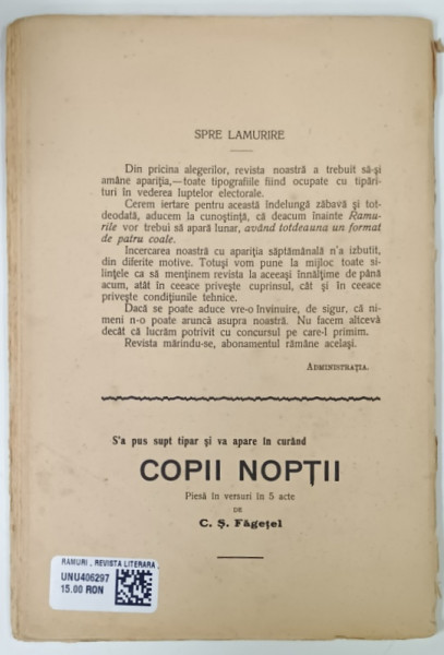 RAMURI , REVISTA LITERARA , ANUL VI , NO. 16 , 1911