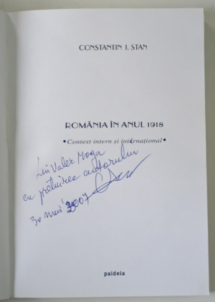 ROMANIA IN ANUL 1918 , CONTEXT INTERN SI INTERNATIONAL de CONSTANTIN I. STAN , 2004 *DEDICATIE
