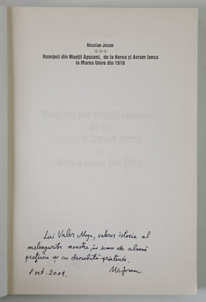 ROMANII DIN MUNTII APUSENI DE LA HOREA SI AVRAM IANCU DE LA MAREA UNIRE DIN 1919 de NICOLAE JOSAN , 2001 *DEDICATIE
