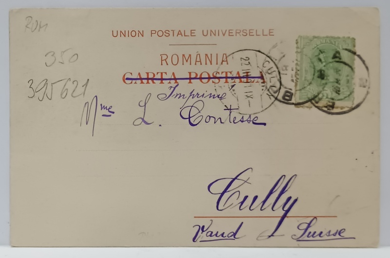 CARTE POSTALA ILUSTRATA , POLICROMA , CIRCULATA , CROMOLITOGRAFIE , CONTINE : SCENA DE LA BALCI CU LEAGAN SI OAMENI LA HORA / GRUP DE LAUTARI / FEMEIE IN PORT POPULAR SPECIFIC ZONEI / CAR TRAS DE BOI , REPRODUCERI DUPA ACUARELE ORIGINALE