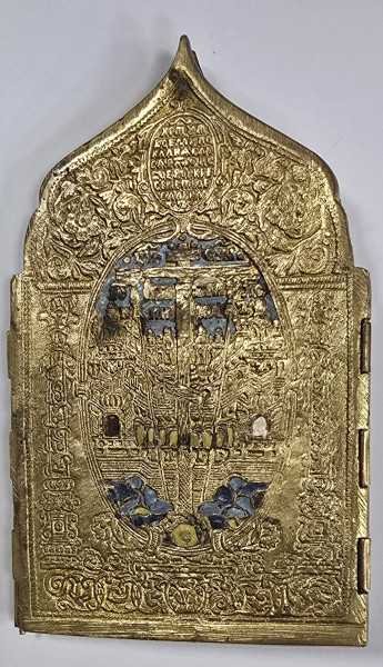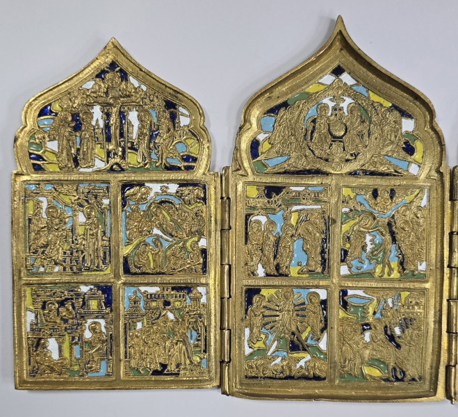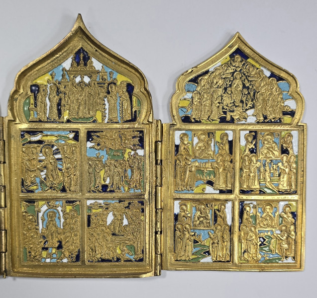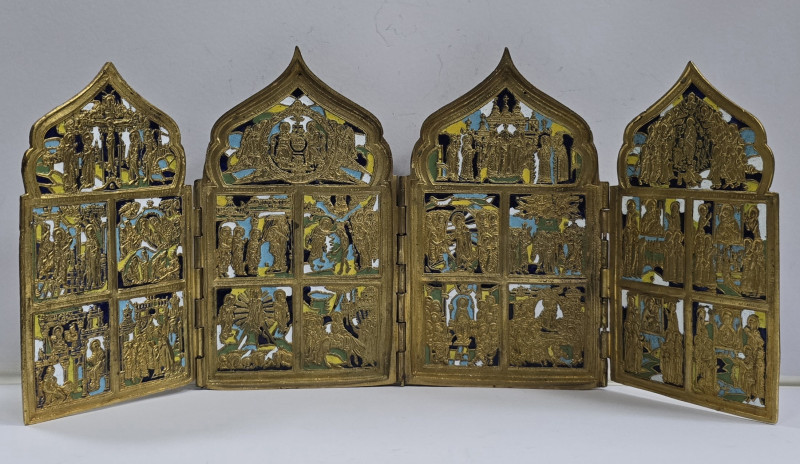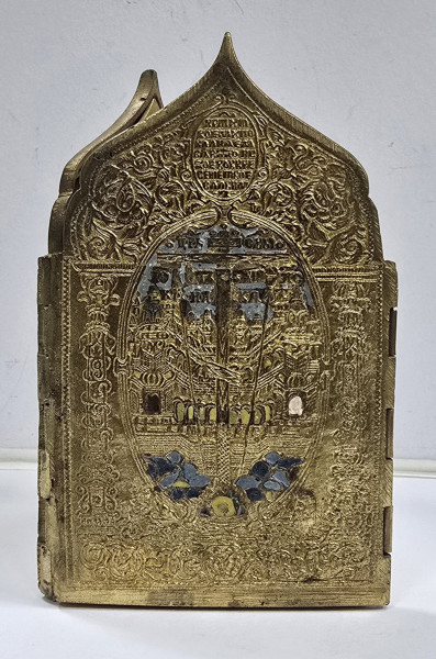 Triptic de calatorie din bronz aurit, decorat cu email policrom