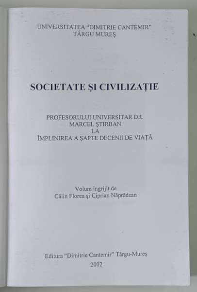 SOCIETATE SI CIVILIZATIE , PROFESORULUI UNIVERSITAR DR. MARCEL STIRBAN LA IMPLINIREA A SAPTE DECENII DE VIATA , volum ingrijit de CALIN FLOREA si CIPRIAN NAPRADEAN , 2002