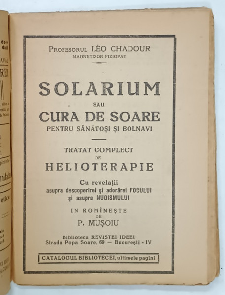 SOLARIUM SAU CURA DE SOARE PENTRU SANATOSI SI BOLNAVI , TRATAT COMPLECT DE HELIOTERAPIE de LEO CHADOUR , EDITIE INTERBELICA