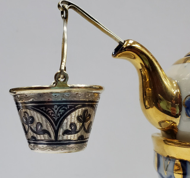 Strecuratoare din argint pentru ceai in forma de galetusa, aurita la interior.