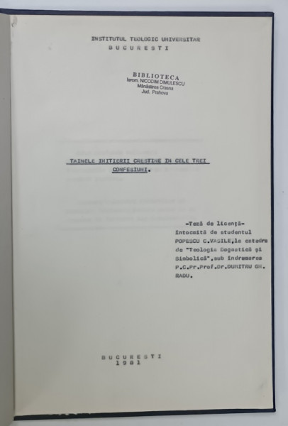 TAINELE INITIERII CRESTINE IN CELE TREI CONFESIUNI , TEZA DE LICENTA de POPESCU C. VASILE , 1981