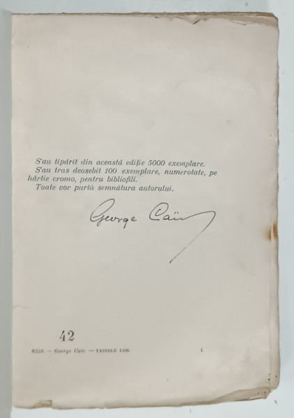 EXEMPLAR 42/100 CU SEMNATURA AUTORULUI LA JUSTIFICAREA TIRAJULUI SI DEDICATIE.