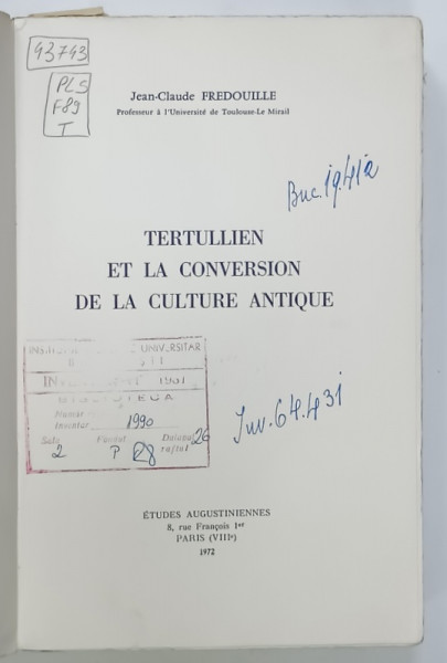 TERTULIEN ET LA CONVERSION DE LA CULTURE ANTIQUE par JEAN - CLAUDE FREDOUILLE , 1972 , PREZINTA URME DE UZURA