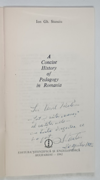 THE CONCISE HISTORY OF PEDAGOGY IN ROMANIA de ION GH. STANCIU , 1982 *DEDICATIE