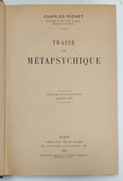 TRAITE DE METAPSYCHIQUE par CHARLES RICHET , 1923