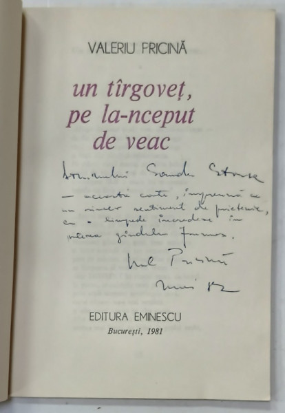 UN TARGOVET PE LA - NCEPUT DE VEAC , versuri de VALERIU PRICINA , 1981 , DEDICATIE *