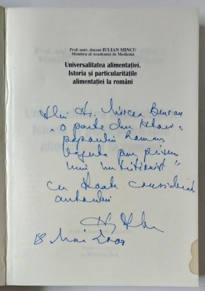 UNIVERSALITATEA ALIMENTATIEI , ISTORIA SI PARTICULARITATILE ALIMENTATIEI LA ROMANI de IULIAN MINCU , 2000 *DEDICATIE