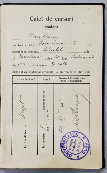 UNIVERSITATEA REGELA FERDINAND I, CARNET DE CURSURI, 1933