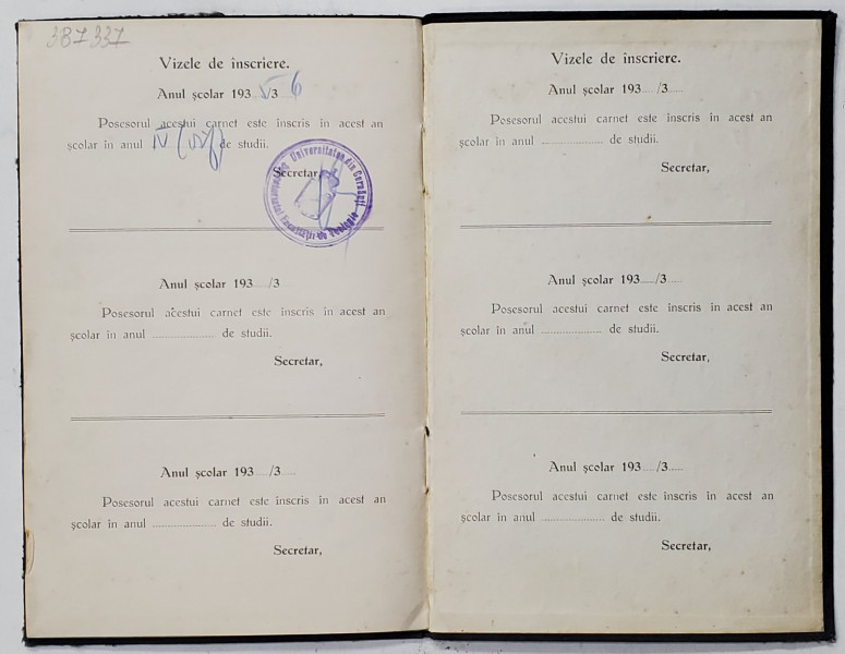 Universitatea 'Regele Carol II' din Cernauti, Facultatea de Teologie, Carnet de Cursuri, 1935