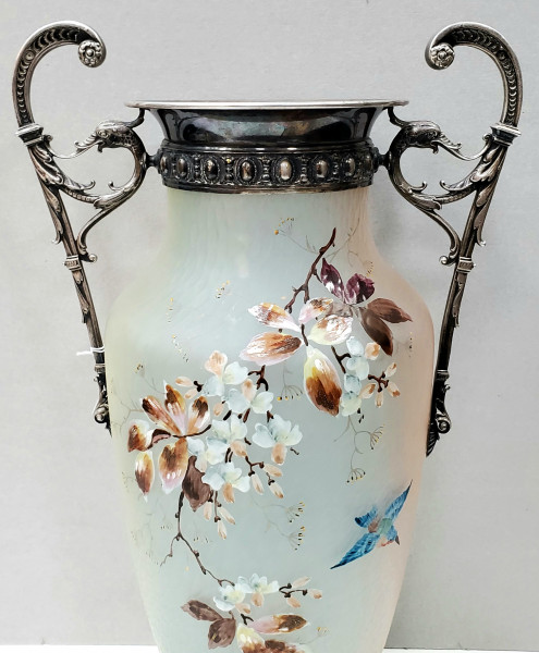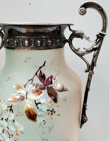 Sticla pictata manual si montura argintata.