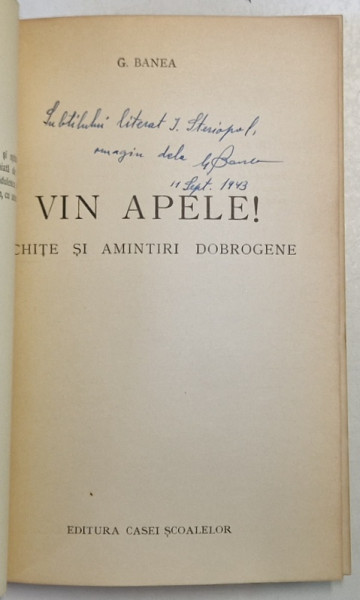 VIN APELE! SCHITE SI AMINTIRI DOBROGENE de G. BANEA, 1940 DEDICATIE*