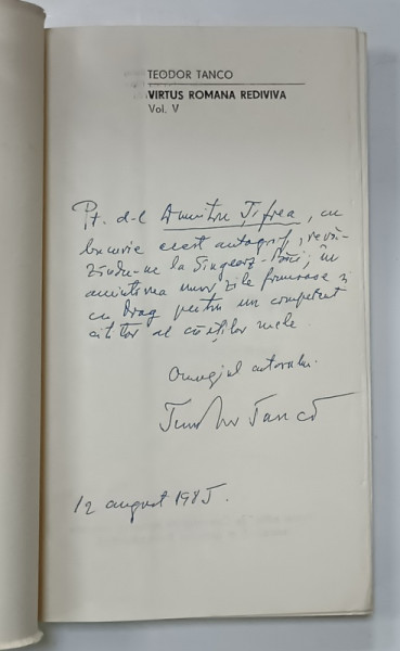 VIRTUS ROMANA REDIVIVA , VOLUMUL V : MEMORIA PREZENTULUI de TEODOR TANCO, 1984, DEDICATIE *