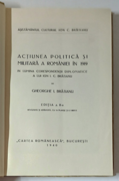 ACTIUNEA POLITICA SI MILITARA A ROMANIEI IN 1919 IN LUMINA CORESPONDENTEI DIPLOMATICE A LUI ION I.C. BRATIANU de GHEORGHE I. BRATIANU , 1940 * COPERTA RESTAURATA