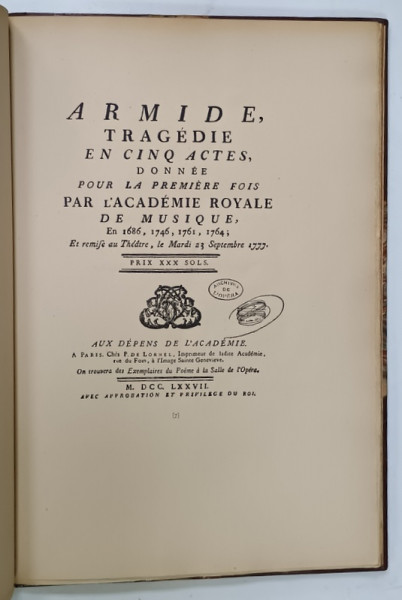 ARMIDE , TRAGEDIE EN 5 ACTES ET 8 TABLEAUX , 1777 , EDITIE ANASTATICA , RETIPARITA 1905