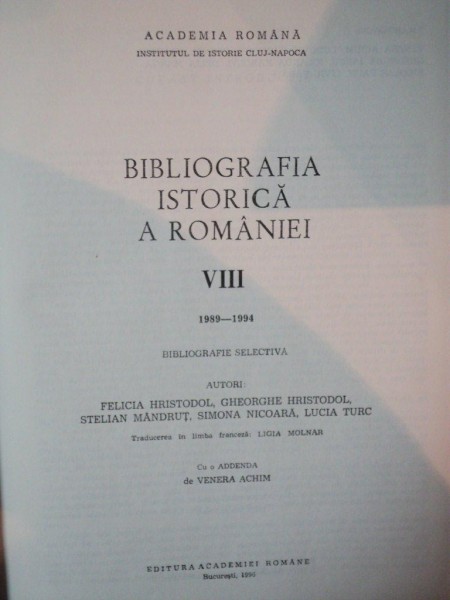 BIBLIOGRAFIA ISTORICA A ROMANIEI VOL. VIII 1989-1994, FELICIA HRSTODOL , GHEORGHE HRISTODOL , STELIAN MANDRUT , SIMONA NICOARA , LUCIA TURC , BUCUREST 1996