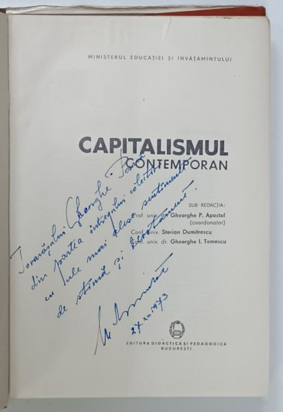 CAPITALISMUL CONTEMPORAN ,coordonator GHEORGHE P. APOSTOL , 1973 , DEDICATIE CATRE GHEORGHE PANA *