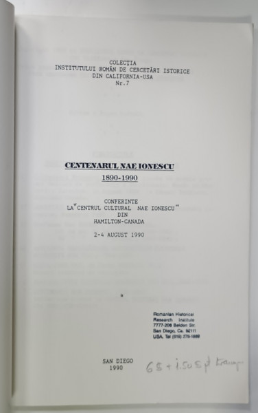 CENTENARUL NAE IONESCU , 1890 -1990 , CONFERINTE LA ' CENTRUL CULTURA L NAE IONESCU ' DIN HAMILTON - CANADA , 1990