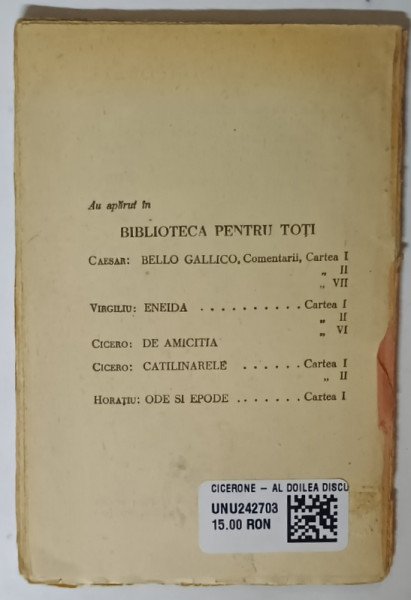 CICERONE - AL DOILEA DISCURS IMPOTRIVA LUI L. CATILINA , INCEPUTUL SEC . XX , LIPSA COPERTA SPATE