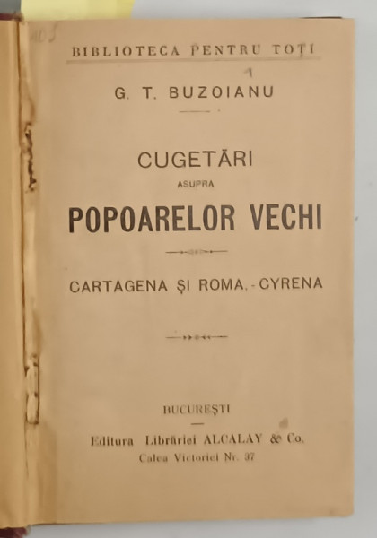 EDITURA LIBRARIEI ALCALAY et CO. , CONTINE : 1. CUGETARI ASUPRA POPOARELOR VECHI de G.T. BUZOIANU - 80 PAGINI , 2. OAMENI SI FAPTE DIN TRECUTUL ROMANESC de N. IORGA - 128 PAGINI , 3. INTREBUINTAREA VIETII de SIR JOHN LUBBOCK -94 PAGINI , 4. STIINTA SI ENERGIE de C. RADULESCU - MOTRU - 122 PAGINI , FORMAT MIC , LEGATURA CARTONATA