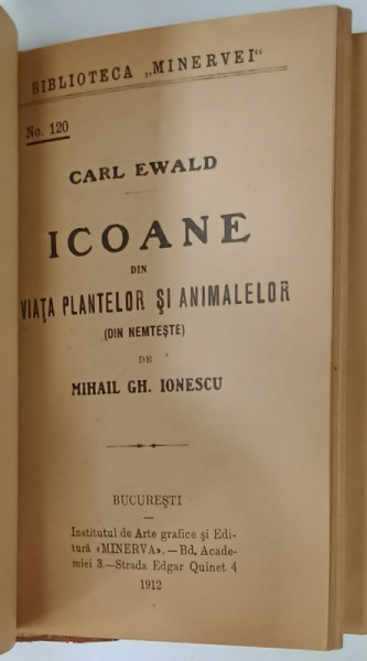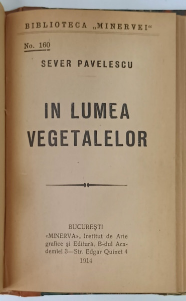 CONTINE : 1. PLANTELE DE LEAC de VICTOR STANCIU - 98 PAGINI , 2. ICOANE DIN LUMEA PLANTELOR de Dr. ALEXANDRU BORZA - 88 PAGINI , 3. ZARI DIN UNIVERS - DIN ASTRONOMIA SISTEMULUI SOLAR de GAVRIL TODICA -96 PAGINI , 4. POVESTIRI DIN NATURA de TOMA COCISIU - 57 PAGINI , 5. GENERATIUNEA SPONTANEE si DARWINISMUL - de N. LEON - 88 PAGINI , 6. DARWINISMUL de EMILE FERRIERE - 83 PAGINI , 7. ICOANE DIN VIATA PLANTELOR SI ANIMALELOR dE CARL EWALD - 88 PAGINI , 8 . INTELIGENTA FLORILOR de M. MAETERLINCK - 101 PAGINI , 9. IN LUMEA VEGETALELOR de SEVER PAVELESCU - 93 PAGINI , LEGATURA CARTONATA , COTOR DIN PIELE