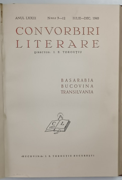 CONVORBIRI LITERARE , ANUL LXXIII , NUMERELE 1 - 12 , IANUARIE - DECEMBRIE , 1940 *AN COMPLET , *CONTINE BUCOVINA , BASARABIA , TRANSILVANIA